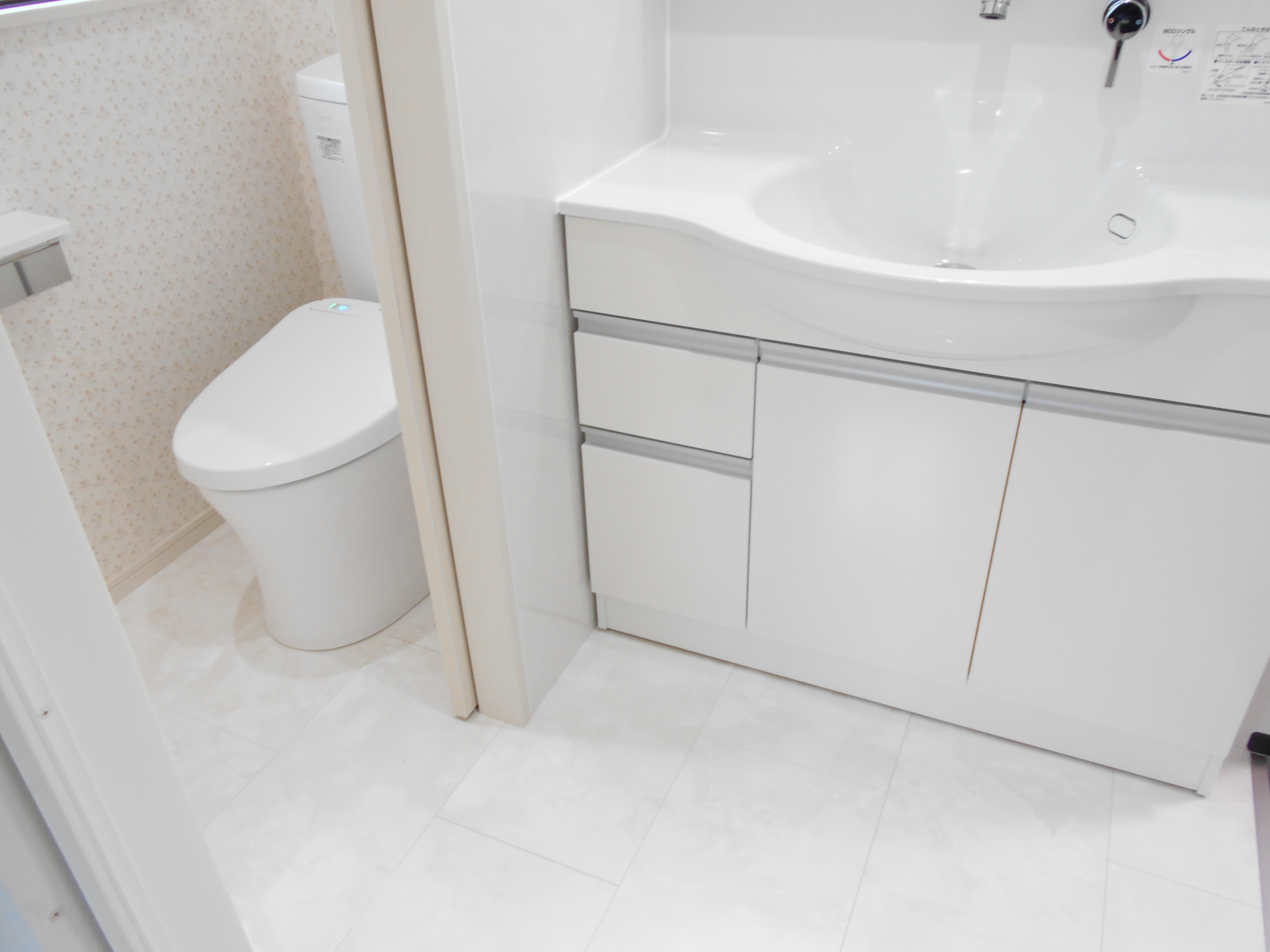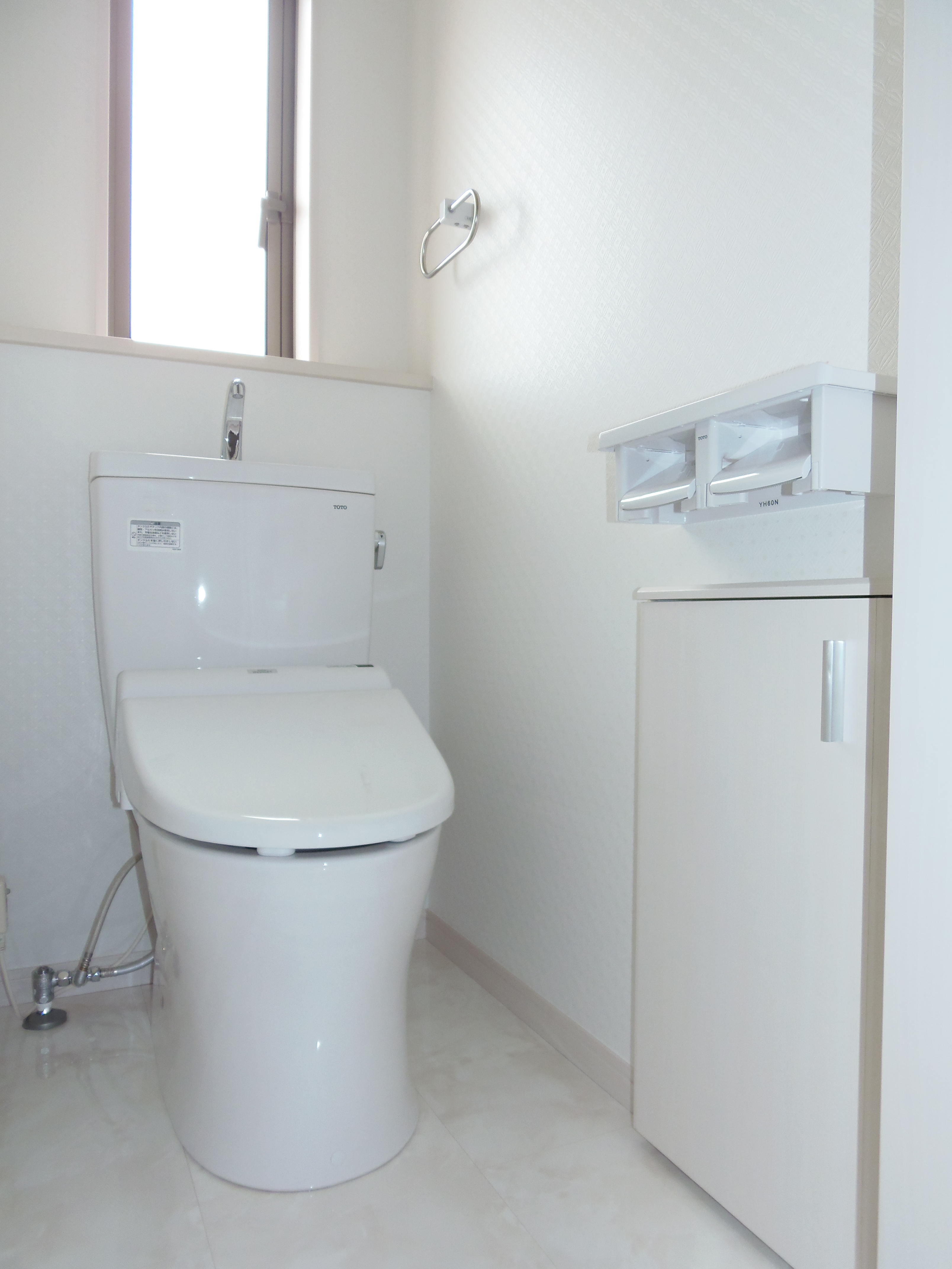 ここだけ白の大理石調のフローリングで仕上げました。便器はTOTOのネオレストです。