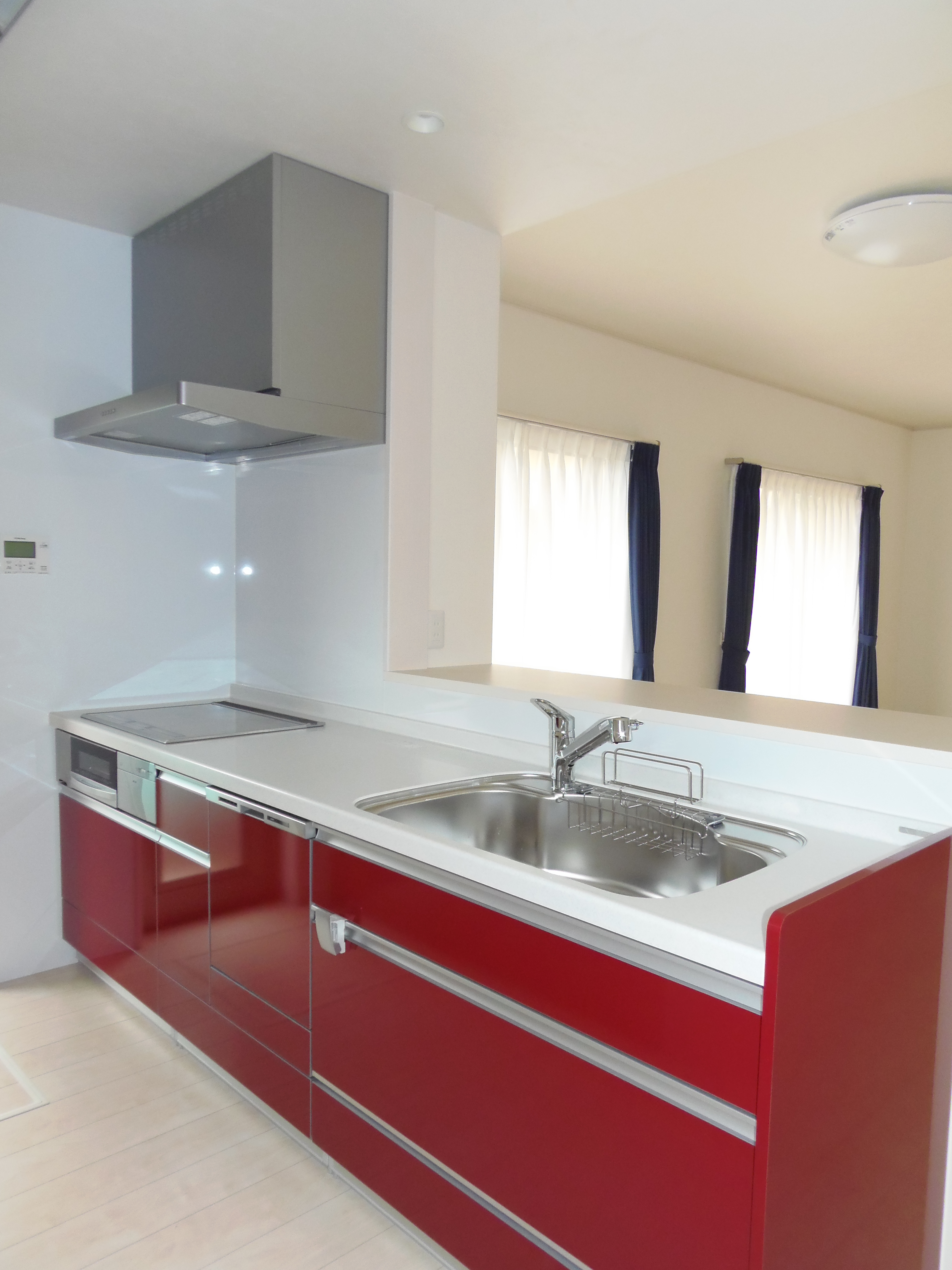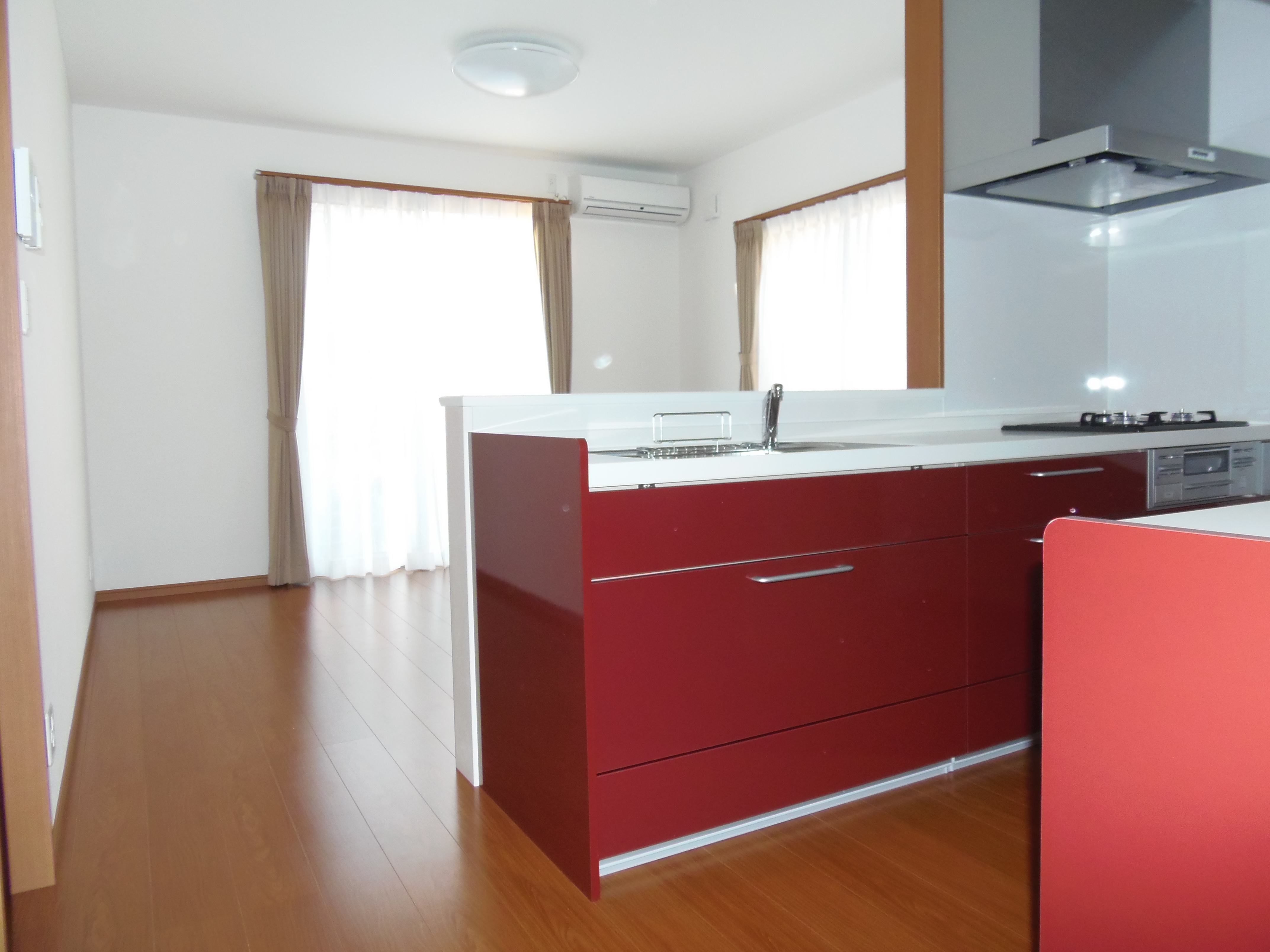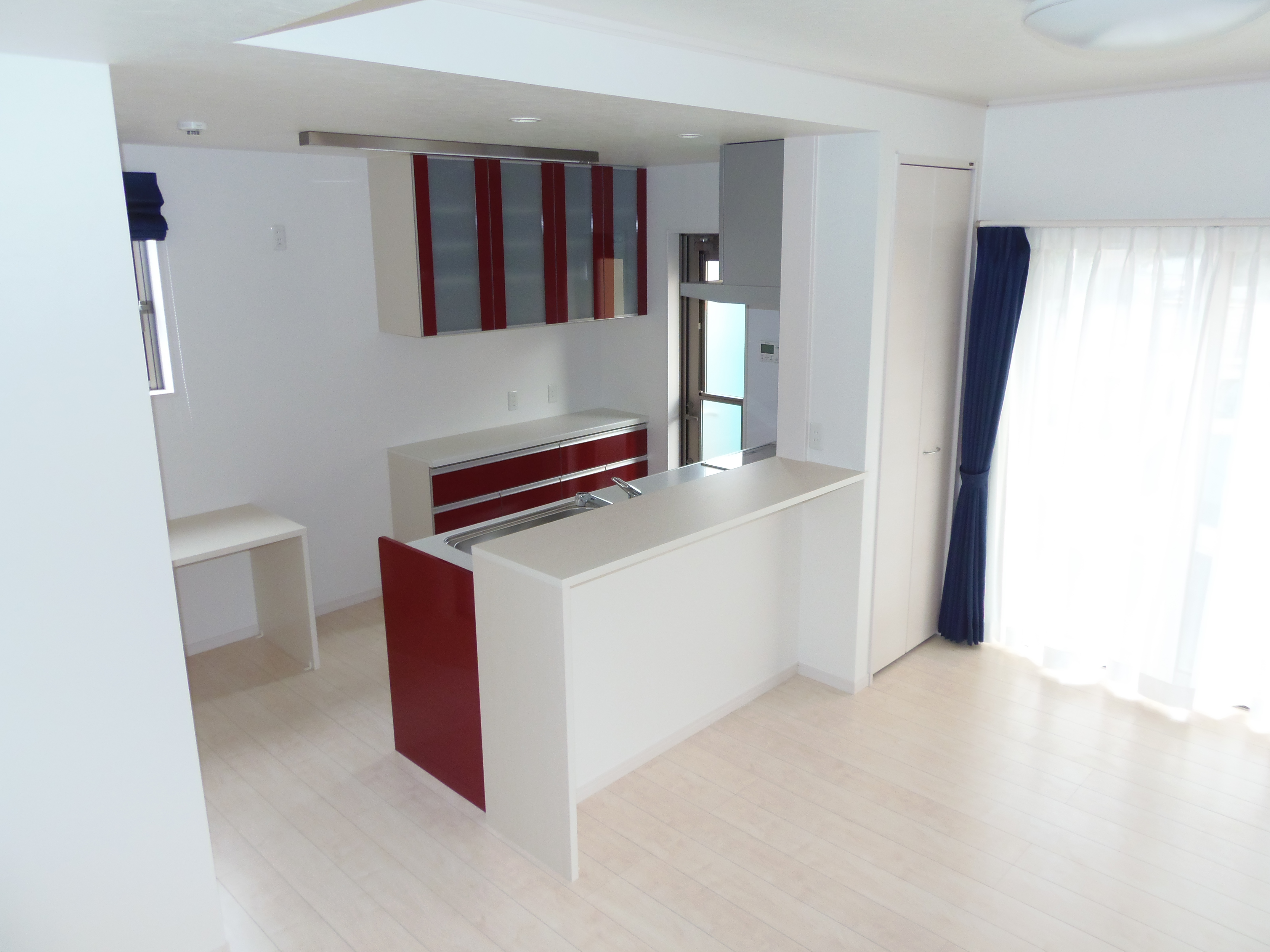 白を基調としたLDK。赤いキッチンをアクセントにしてモダンに仕上げました。