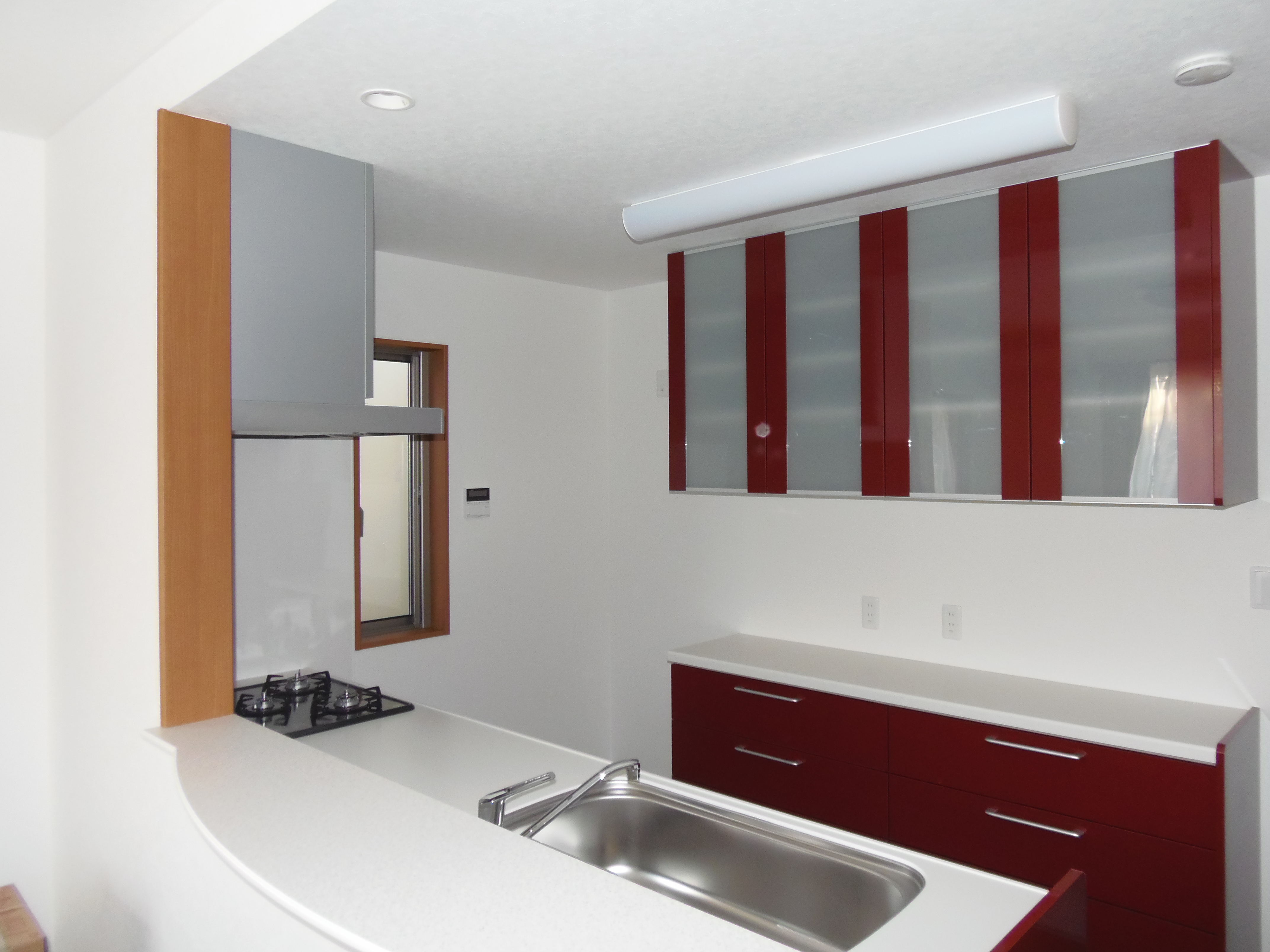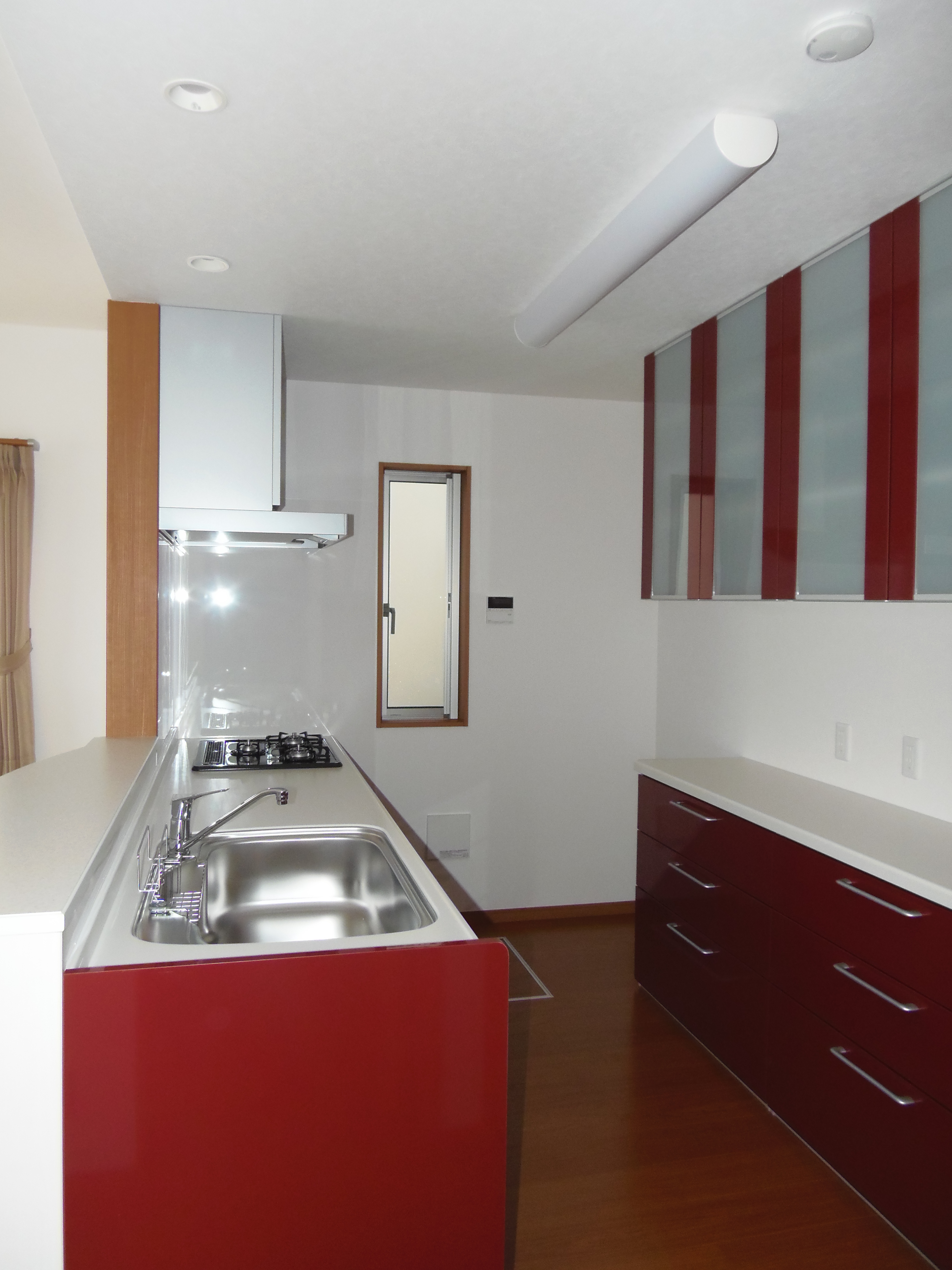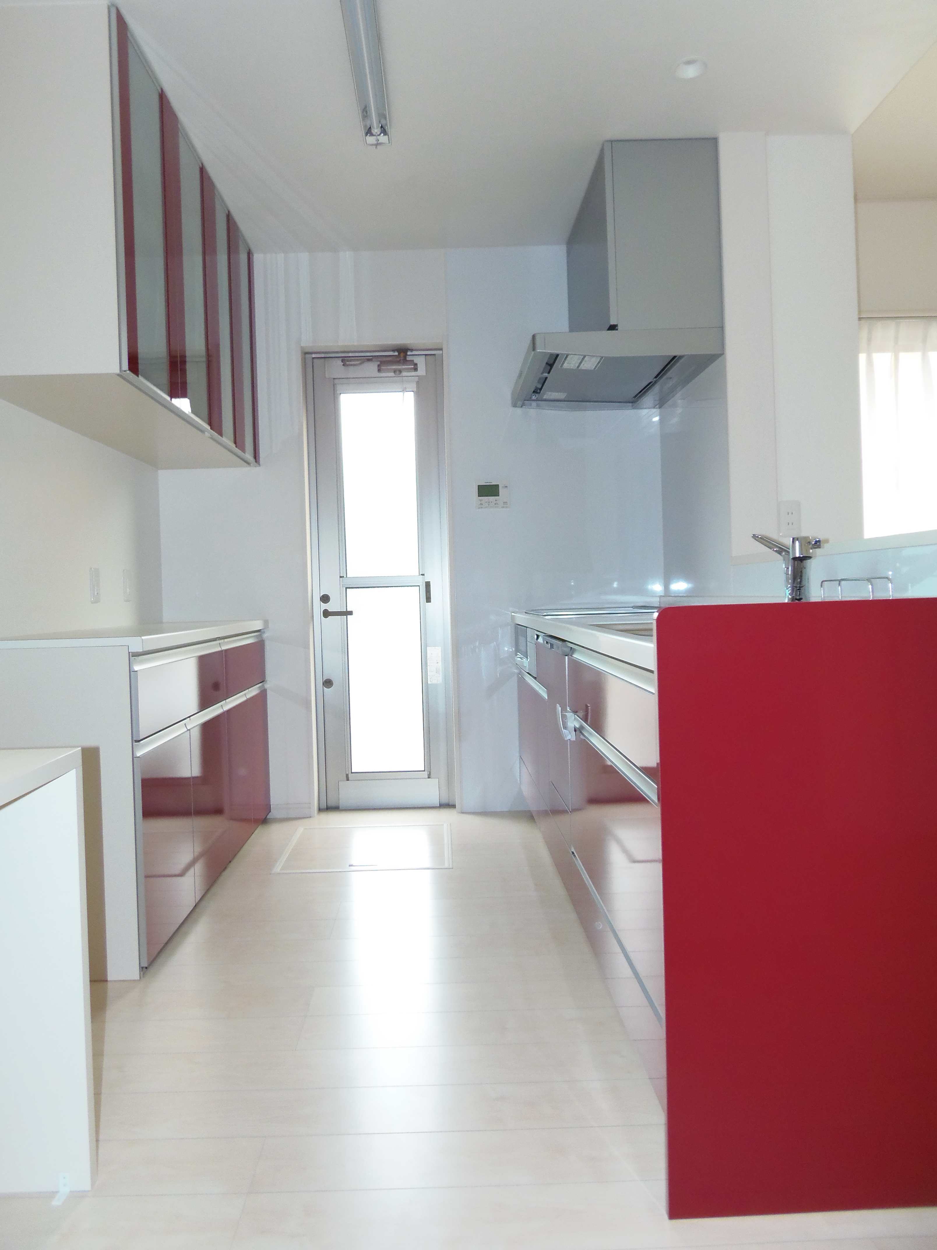 白を基調としたLDK。赤いキッチンをアクセントにしてモダンに仕上げました。
