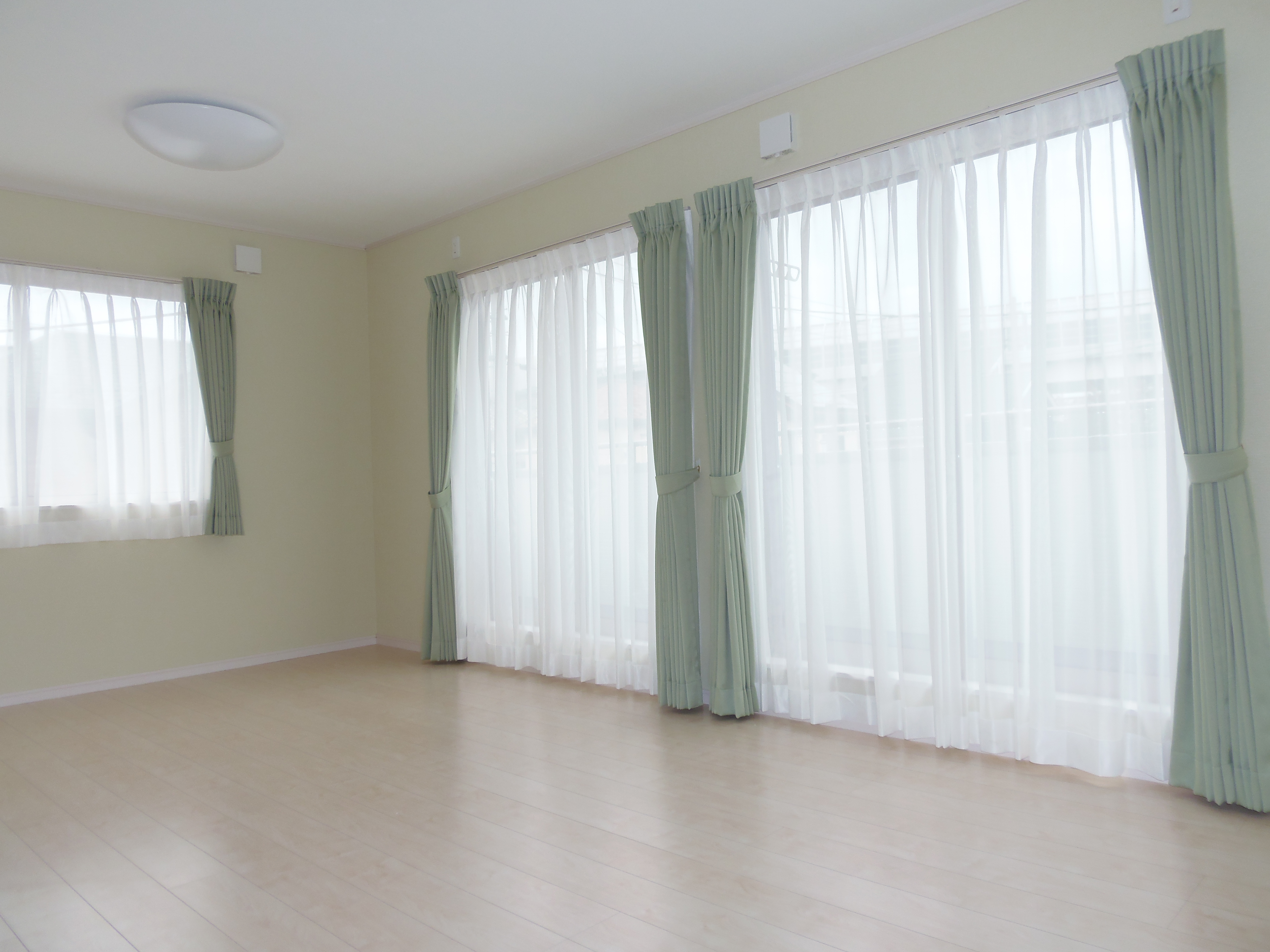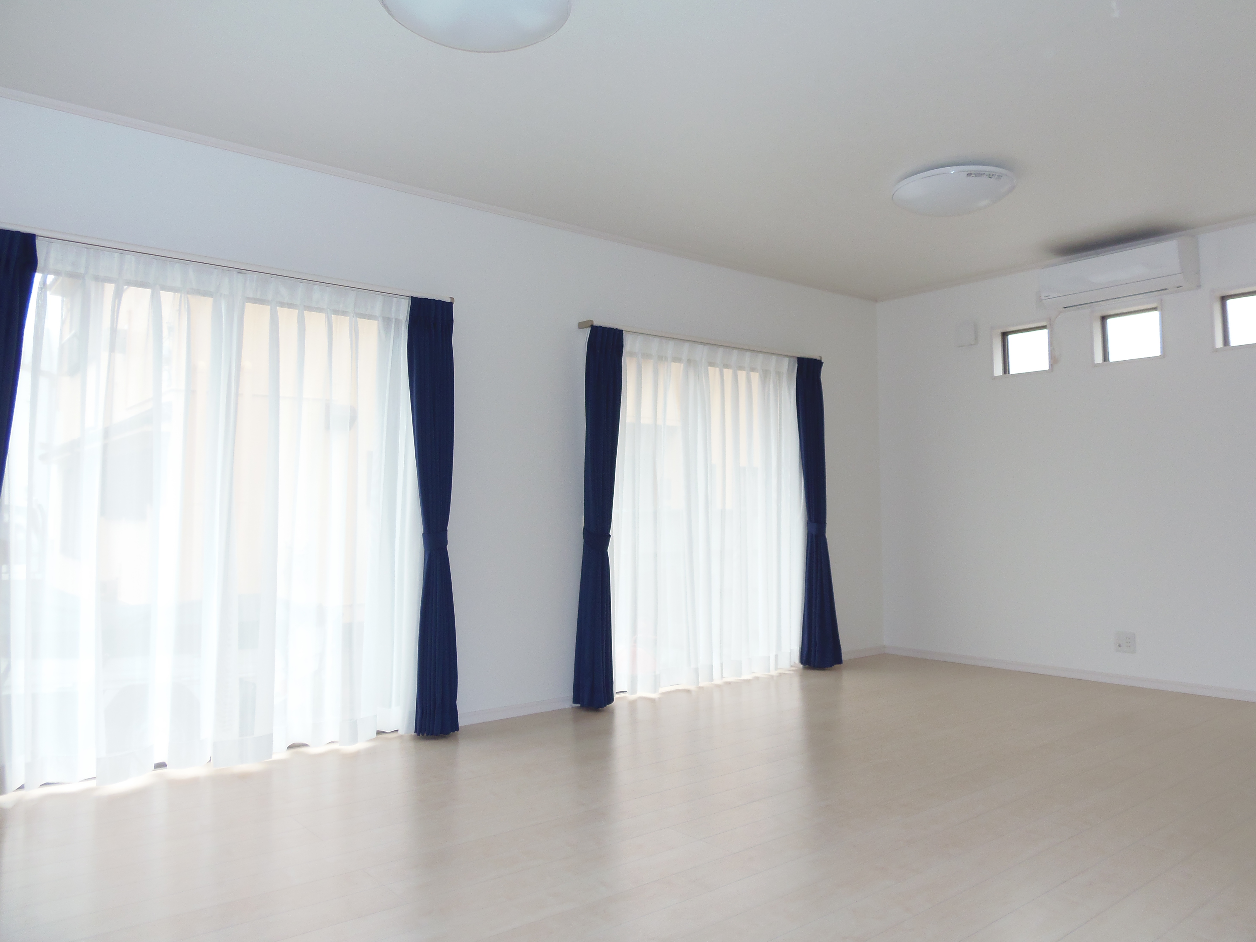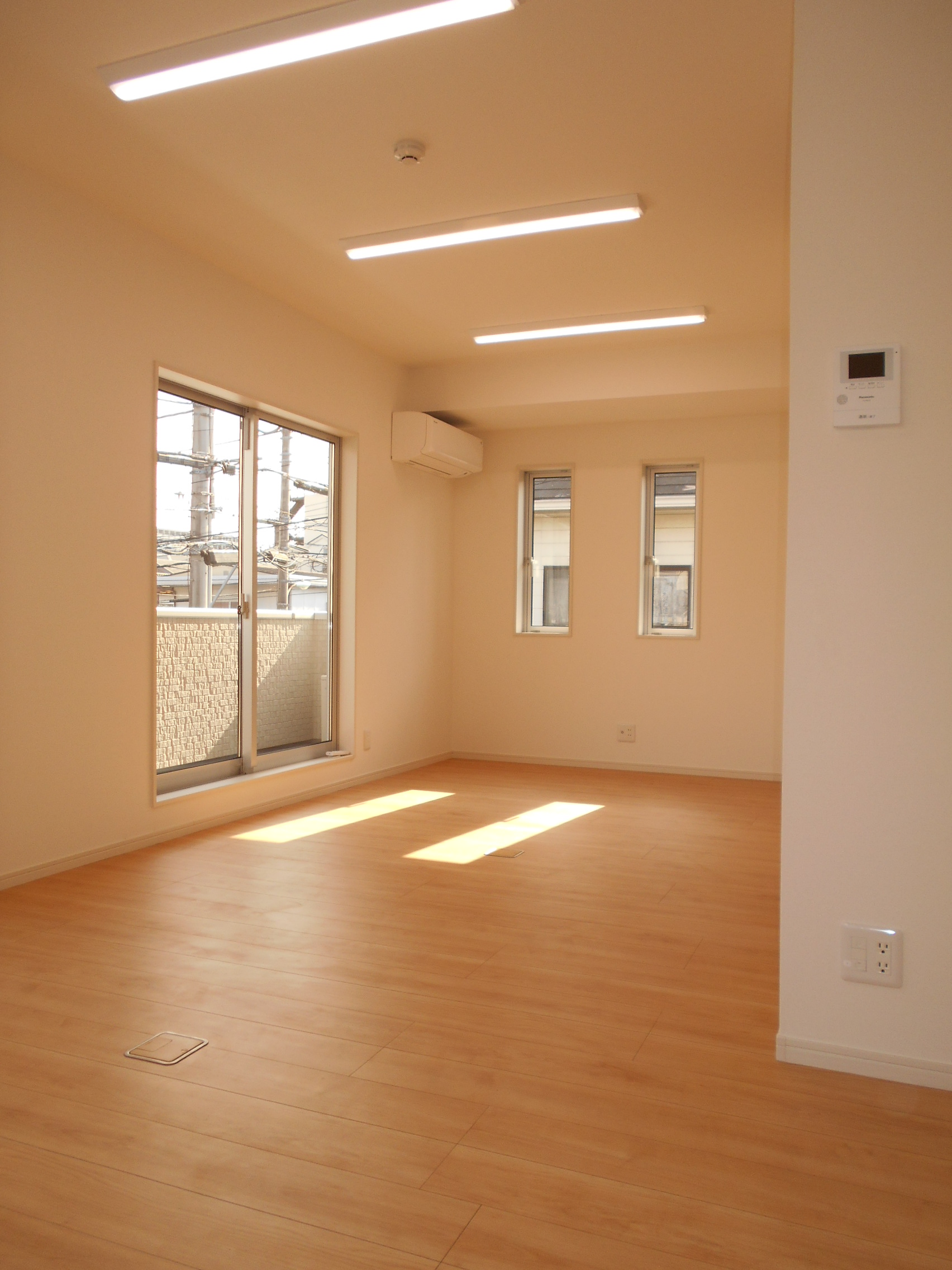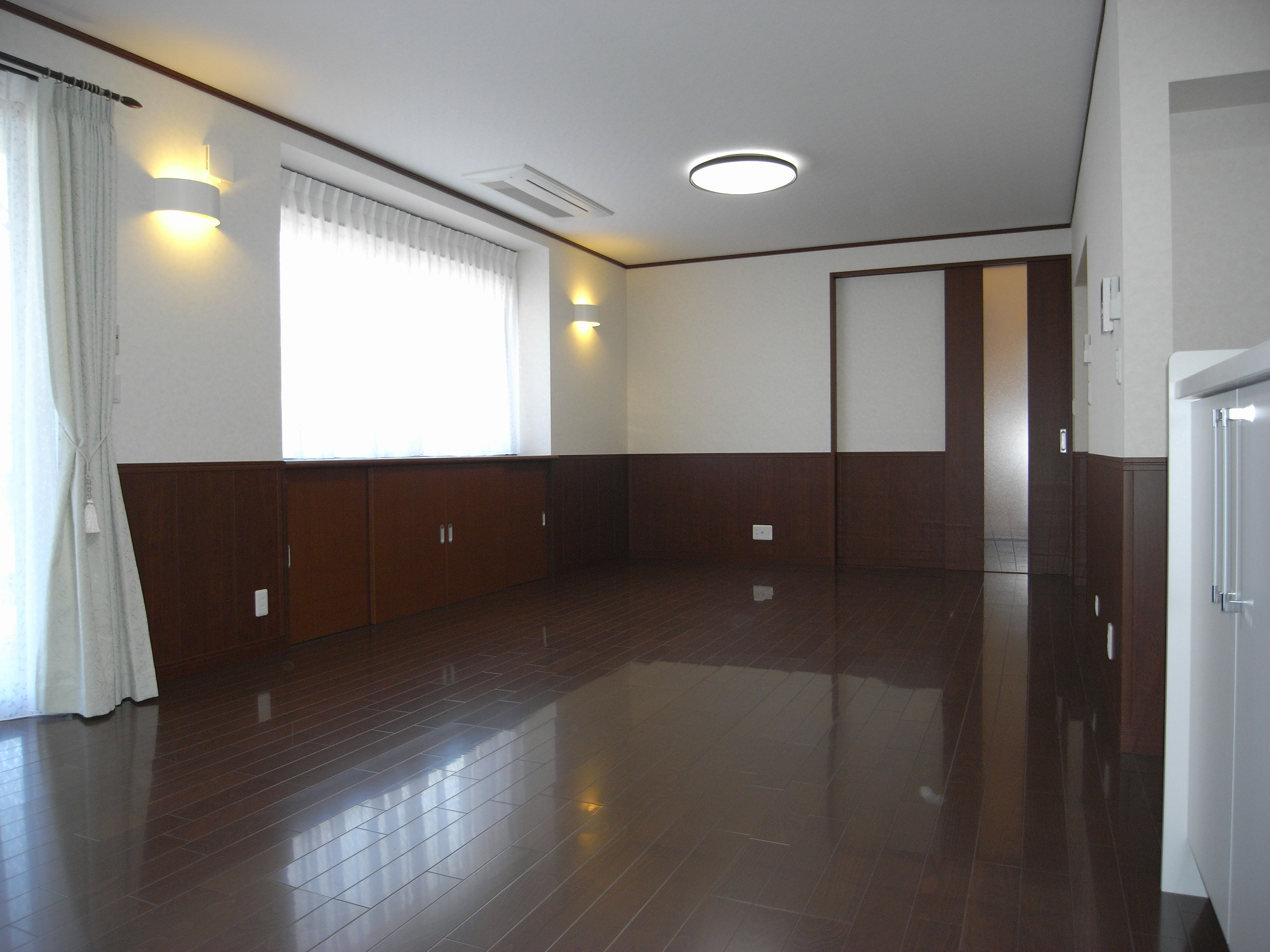 鏡面調の白いフローリングに、白いキッチン。広~~~いリビング、最高です。