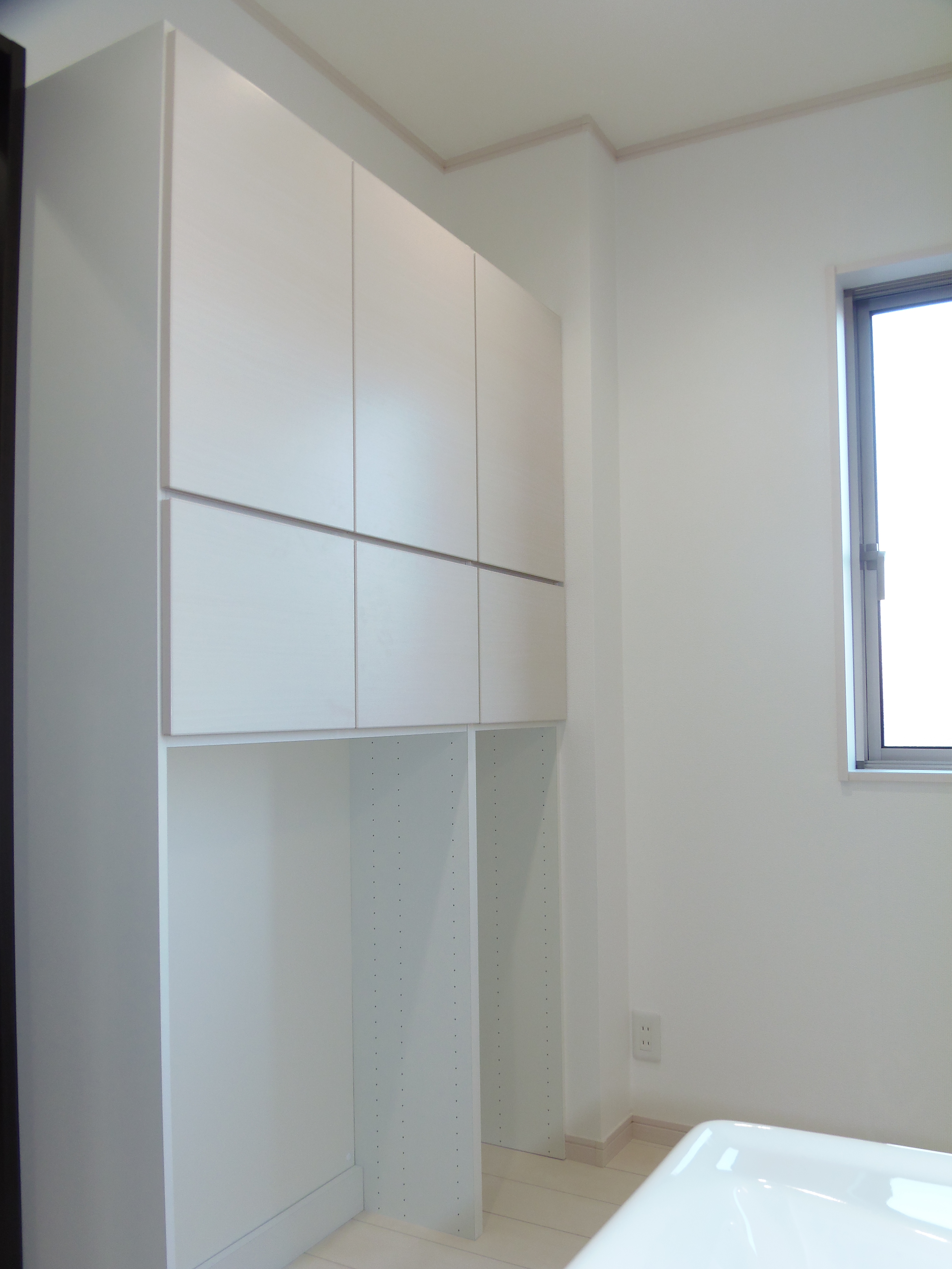 洗濯機置き場の上部には棚を設けて、洗剤等を置けるようにしました。